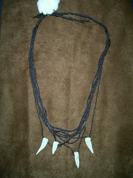 The necklace was my first piece of art. I started with a simple paste made out of flour, water and white glue, molding what looked like fangs (image #3). While they solidified a bit, I gathered brown yarn from my knitting basket and threaded some in a thick needle to run through the fangs. This way, I could tie them to the necklace, which itself wasn’t hard to recreate: plenty of yarn to go around 5 or 6 times in lose loops, fangs tied to strategic spots, braided ends so it wouldn’t fall apart. It turned out nice (image #4) and even though the cat wanted it for himself too (since he thinks all my yarn are belong to him) I managed to keep it safe.