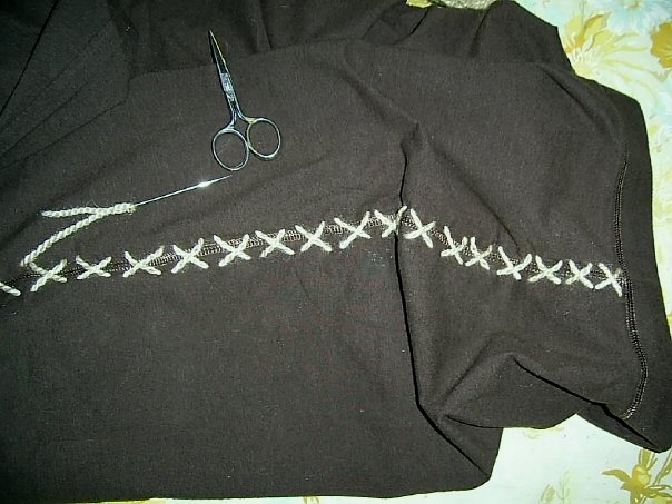Another trip to the thrift store finally provided me with the wide belt I needed for $5 (image #12), as well as comfy and stretchy brown yoga pants (image #13) for $4. Oversized cross stitches with thick beige yarn along the sides were easy enough to do, since cross-stitching used to be a hobby of mine.