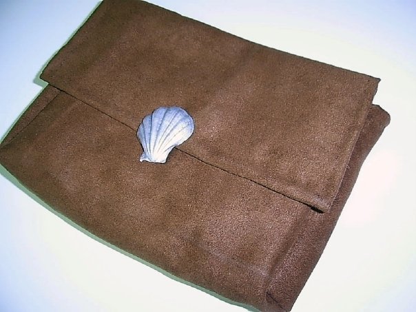 And so, the satchel was my first item. I had no idea of the measurements, so I just opened up a large artwork of Geralt on my computer and made a paper template that seemed ok when placed against me. After having the paper template ready, I used it to cut the suede pieces and sew the satchel. The silver shell came from a trip to the dollar store: a bag of shells and a bottle of silver acrylic paint, and it was ready (image #3).