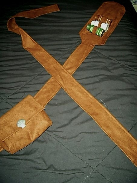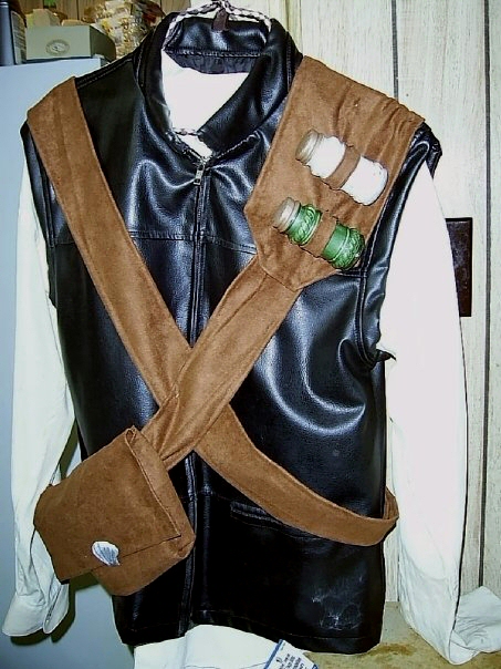 Moving on to the chest straps (image #5), I used the rest of the suede. Let me add that this was all sewn by hand too since I don’t have a sewing machine, and I am slow when it comes to do it by hand, just to make sure the front doesn’t look like total crap. The shoulder piece for the potions was super tricky to do, not the shape itself, but to actually get the bottles to stay still. I did small “ribbons” of suede around each bottle, which I then sew to the shoulder part. But they kept tilting, so back to the dollar store to buy some stretchy clear cord ($1) so I could tie them in place without being extremely obvious. Friends, if you want potion bottles, make sure you get plastic ones instead. The glass ones kept shifting my entire chest arrangement after all was in place. Incredibly frustrating, so I had to attach it all with safety pins to the leather jacket (image #7).