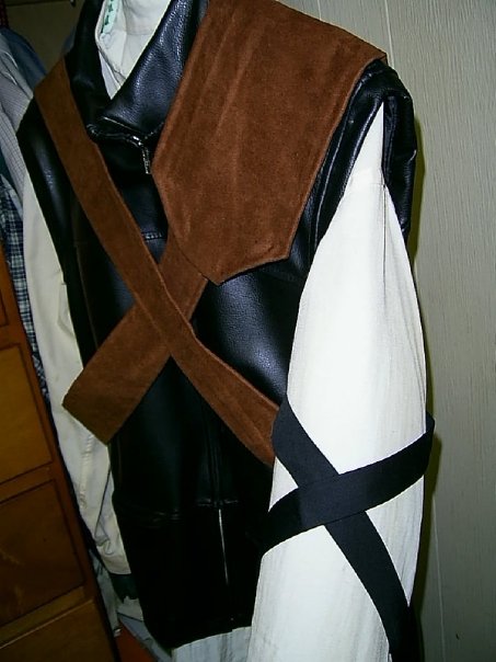 Speaking of which, the leather jacket I found cost me $8 at a thrift store. It had a tear on the sleeve and the cashier made sure I knew that, but no worries, I didn’t need any sleeves. After cutting and altering the collar and removing the sleeves, my Geralt had an $8 vest . As for the shirt, a plain old white shirt did the trick, dyed with tea bags to look dirty. Add some bias tape ($1 at the dollar store) and we have the criss-cross straps on the arms, which I had to slightly stitch under the arm so they would stay in place (image #6).