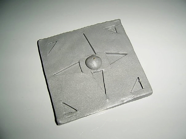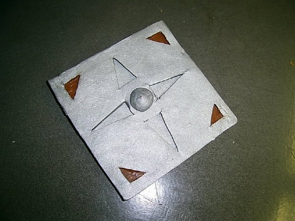 The buckle was another thinking process. I went to a crafts supplies store and bought some silver modelling paste (like Fimo, but cheaper brand). After 2 hours of experimenting how exactly to reproduce the buckle, I figured it out. Two square layers, one with triangle cut-outs in the corners, shaky hands and an x-acto knife worked. Then I stuck a piece of toothpick in the center to hold the little round stud-like piece in place (image #8), and baked it. Omnom! Freshly baked buckle with a silver coat of paint for added realism and painted brown corners, sticky velcro pieces in the back, and there it was, ready to attach to the chest straps (image #9).