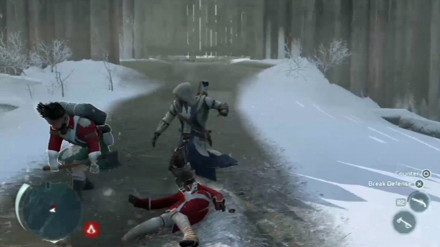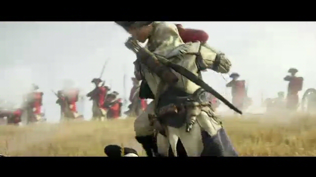 Ubisoft then emphasizes Assassin’s Creed III, which takes place during the American Revolution and stars a new hero. In the trailer we see Connor fight his way through a series of redcoats, spotting his target, shooting him with an arrow and finishing him off with a strike of his tomahawk. Definitely inspired by Native American heritage. The gameplay demo followed, as Connor runs through snowy woods, jumps cliffs, climbs trees and does some branch to branch acrobatics. A bow and arrow is used to hunt a deer. Knife and gun combat with a pack of wolves follows. A quest initiates on passing by. Horseback riding his way up the hills, Connor eventually dismounts and climbs a tree, surprise-attacking more redcoats near a fort. Rooftop action ensues, with a target in sight.