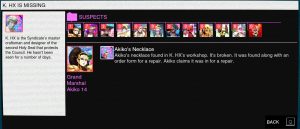 Evidence 1: Akiko’s Necklace. Examine one of the hotspots inside K. HX’s Workshop, by the entrance.