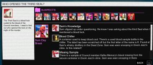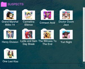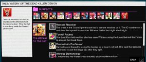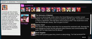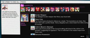 This guide is a checklist of all the crimes, suspects and evidence you need in order to find out the whole story. To be able to interrogate further, you need to increase your friendship level with the suspects. Go to them and choose to hang out, wait a few minutes and do it again. Reach max hangout level with all 10 characters to get their respective achievements.