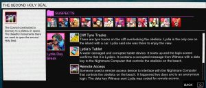 Evidence 1: Ornate Ring. Increase relationship level with Lydia until she shares information about Yuri’s ring. Then examine one of the hotspots on K.HX’s body, found along the northeastern shore.