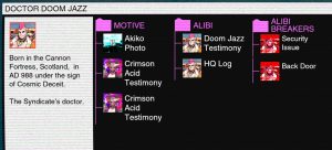 Evidence 1: Death Screams. Increase relationship with Doom Jazz and probe for new evidence, then ask Witness about the screams.