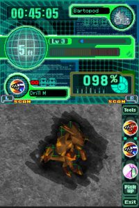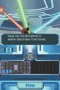 The fossil is the initial form of a Spectrobe. Fossils are found by searching and digging (see respective chapter). Fossils can be taken to the ship’s lab to be awaken. You launch a fossil into the chamber and you must use your voice to keep the volume between the brackets or past the mark during three seconds. You must find a tone that works for your voice, but I actually found that you can do it just as well by blowing on the microphone.
