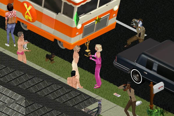 Being famous and getting along with your fans can also grant you awards, respectively the Simmy and the Sim Choice Award. A Sim Marilyn Monroe will come to your door to give you these.