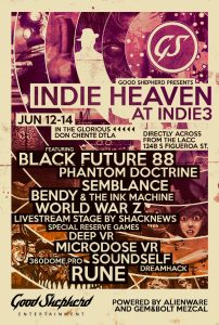 LOS ANGELES – May 14, 2018 – Good Shepherd Entertainment and its many gaming partners have announced the latest addition to IndiE3 – Indie Heaven – three full days of meeting, greeting and eating alongside a fantastic gathering of independent games and gamemakers from June 12-14 at Don Chente DTLA (1248 S. Figueroa St.). The space is directly across the street from the Los Angeles Convention Center – right above Hooters – and adjacent to the legendary Devolver Lot.