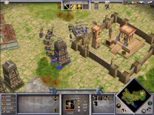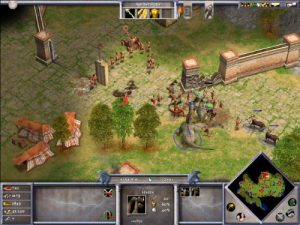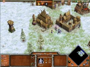 Graphically, this game is much improved. Each civilization’s buildings look completely different from the others. If you have enough memory and graphic card performance capability, you can also change the camera rotation angle, so you can spin the whole screen around with your mouse wheel (that thing in the middle that you generally use for scrolling), kind of like the movie The Matrix. You can also rotate buildings around if you are going for a particular look. Houses look kind of fun when they are all facing different directions. The units are nicely designed with a great level of detail to be distinguishable between civilizations. Trees will actually fall over when you start chopping them. There are different types of terrain that fit each civilization, but it’s more for appearance than anything else. The play interface is generally the same as before, except the menu for villagers has been simplified – no more having to click on a button to build, repair, etc. etc. all you have to do is click on a villager and the full menu of things they can build or do will pop up. If you want to gather resources you just right click on the resource for that villager to gather. If you want to build a building, you just click on the villager and then click on whatever building you want to build. You can also custom-assign your hot-keys if you are big into using the keyboard (which many power-players are, because it’s much faster than using a mouse). There are some cute chat messages that come from the computer players also, which clue you in as to what they are doing, and where they are at in their advancement.