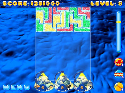At first glance, it might seem a bit like upside-down Tetris, but instead of putting the pieces together, you have to take them out of the puzzle board. You have to match two pieces by shape to remove them, and you get extra points if you also match them by color. The mass of pieces just keeps coming until the block with the number for the stage appears. When it does, you have to isolate it by removing all the pieces around it, and only then you can advance. When you clear the board, that stage becomes free of snow, and little by little the game world becomes a warmer place to live in.