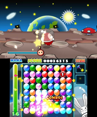 With the game’s focus on the touch screen, the object is to drag the stylus across two or more balloons (whether they match in color or symbol doesn’t matter) to make them explode. In doing so, the board’s remaining balloons will rise towards the top to fill in the holes, with the object being to create explosions so that these rising balloons will create matches of three or more like colored balloons. It’s a complex setup that requires much more thought than simply tapping on groups of balloons that already match, and the game’s mana restrictions don’t help make things easier. For each balloon that you touch with the stylus, you’ll lose a mana point, but this mana meter can be refilled by making explosions. Whether you’re making moves or not, the mana meter will continue to count down to zero, where it’s game over, so gameplay becomes a struggle to keep the bar high enough to make your little critter actually walk on the top screen, while still being able to use mana to actually play the game.