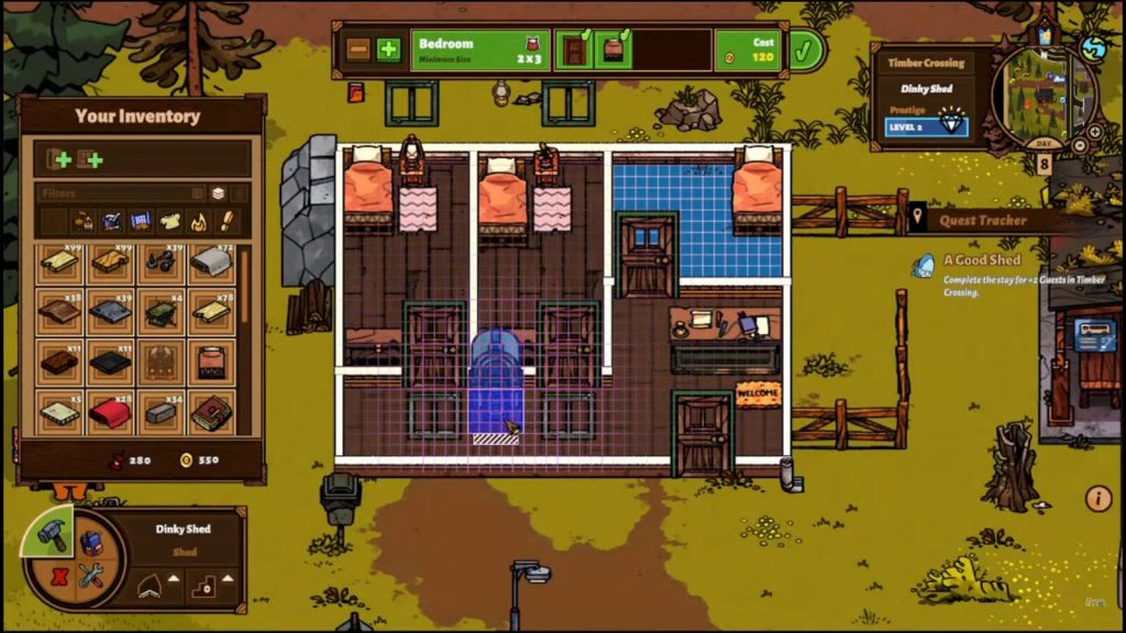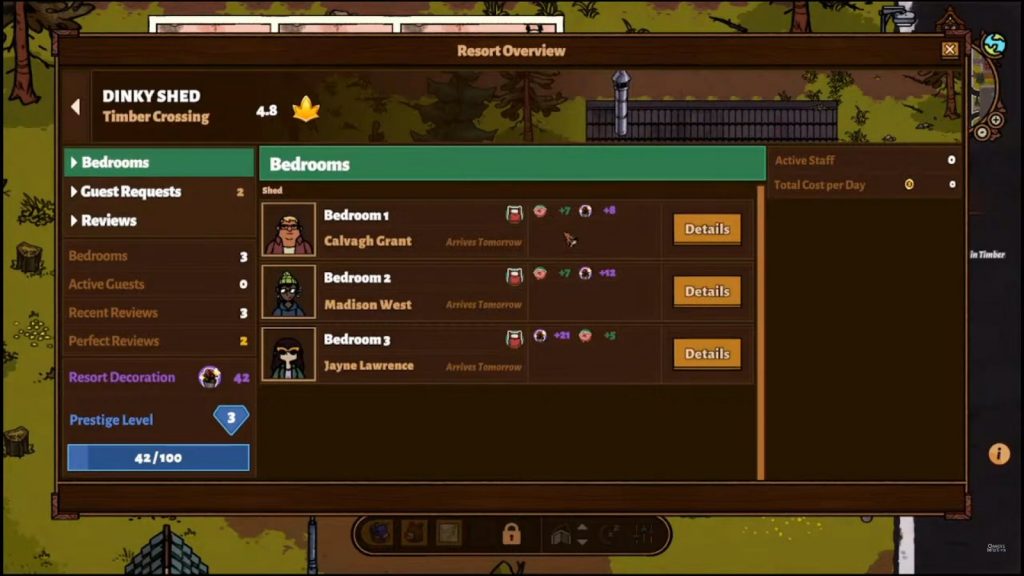 To meet your guests’ needs you must to try to meet their comfort, decoration, temperature and hygiene values by placing them in the appropriate rooms. Guests will leave star ratings depending on how pleased they were with their visit, so make sure you have the right type of accommodation before you accept someone with a high comfort rating into your level 1 bedroom. Facilities and special rooms will also become available and some guests will ask for them as a requirement, such as a campfire, lounge, movie theatre or arcade, even a high food rating. Once you have completed all of Fin’s regular quests, additional optional quests will open up at each resort, which will focus on improving your facilities to higher prestige levels, room levels and 5-star ratings.