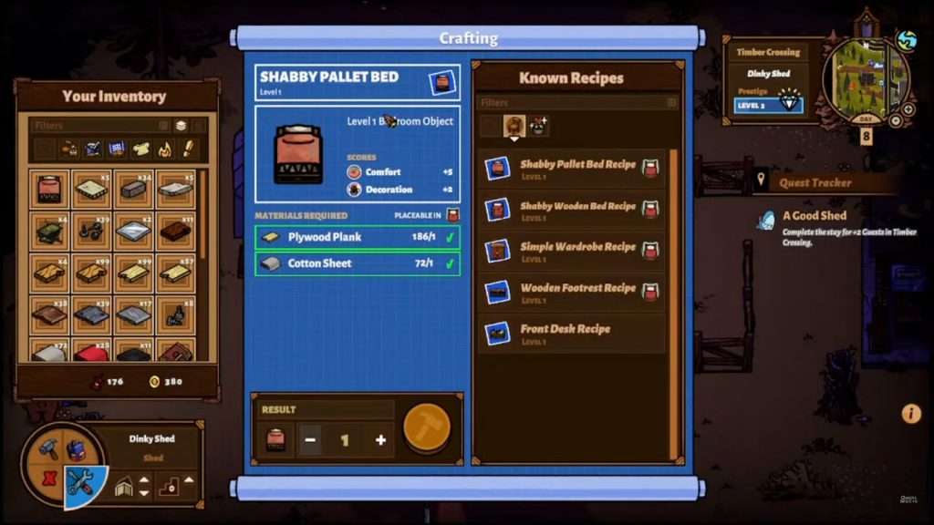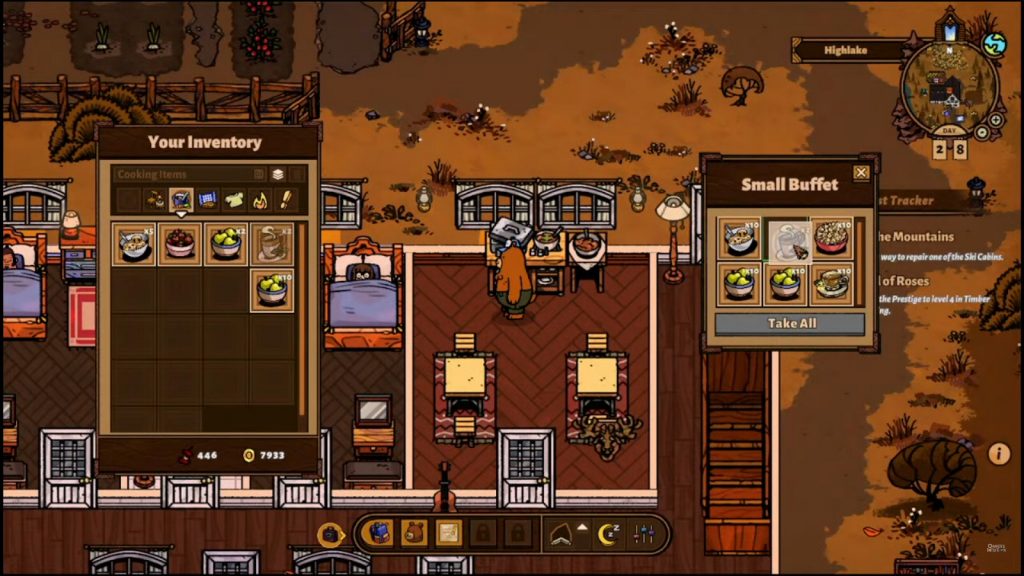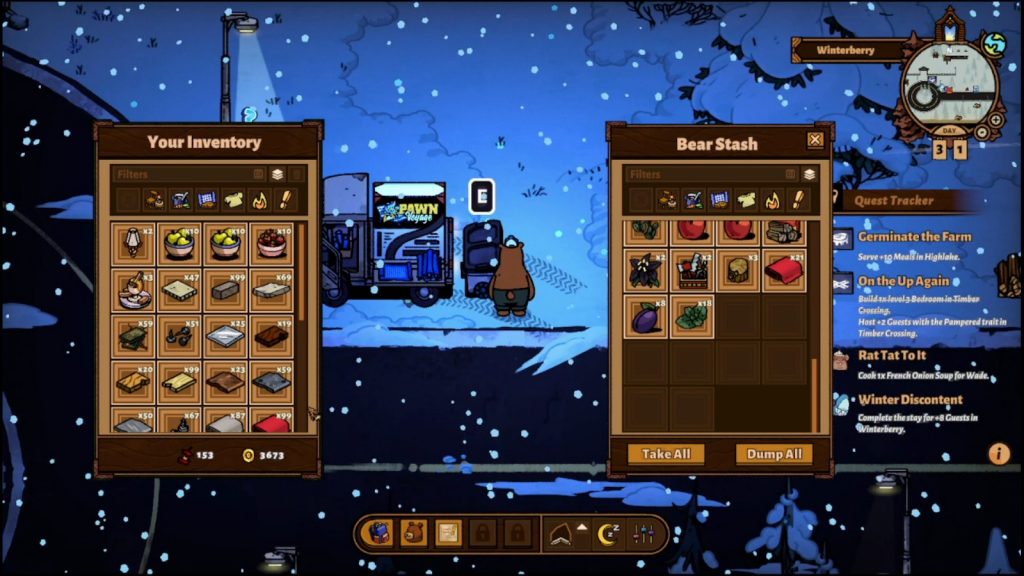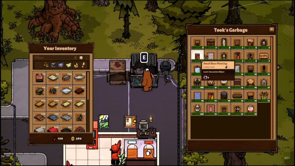 It’s important to note that Hank – our friendly neighborhood bear – has two currencies to work with. Coins are self-explanatory, and they are the currency your guests pay with. This is also how you purchase crafting recipes from the Pawn Voyage and other resources from other characters’ shops. Then there are the Valuables, which are basically… trash. That’s right. Trash that is found when your guests make a mess has value and everything is recyclable! You will learn from a friendly racoon named Took that you can bring in your valuables and trade them for decorative items at her stash (the dumpster).