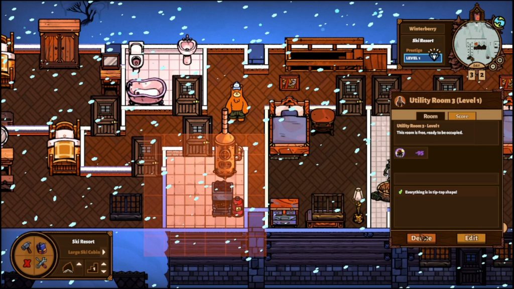 You will also meet several characters that can be assigned as staff. Gus, the weird and somewhat creepy possum, will offer his services as a host, which means you can leave the guest assignments up to him. Jax will help keep the furnaces running in the freezing cold ski lodge, making the temperature comfortable indoors. Julia will offer to cook and serve, keeping the buffet tables stocked. Wade, the little mouse, will gather the garbage your guests leave all over the place – and they will make a mess. You can employ your staff where they are needed the most, or in all buildings all at once. It will cost you quite a bit per day to keep their services though, and obviously you will need to complete their personal quests first, which usually means a considerable amount of time and effort.