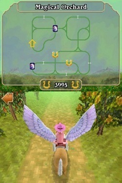 In keeping with the magical theme presented in the game, the title’s graphics contain all the makings of a fairytale storybook with randomly appearing sparkles at every turn, tiny cute flowers dotting the landscape, and lots of shades of pink and purple. And while the horses themselves look quite realistic for a DS title, your human character does not, and is comprised of what appears to be a few squares stacked on top of one another with little in the way of detail to help matters.