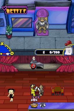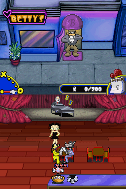 The second part of each shift involves Betty getting on stage and performing. The gameplay here is less complex than in the bar sections, but can be just as challenging towards the end of the 25 shifts. Music notes will be presented on the top screen, and various note choices will rest on the touch screen. As the scroll ball rolls under each note on the top screen, you must tap on the corresponding note to have Betty perform correctly. As the waitress levels get harder, so too do the performing sections, which eventually require lighting fast reflexes to hit the right notes, in the right order, and at the right time.
