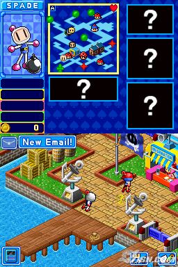 The interface seemed a bit confusing at first, since there is a lot going on in both screens. On the top screen, there is a picture of Cheerful White that represents whatever equipment he has on at the moment, plus a bunch of spaces where your tokens will show up as you get them. The name of the zone in you are in is indicated, as is the map of the current area. Maps with a question mark mean you haven’t gone there yet. Open passages between areas are also indicated. The bottom screen has shortcuts to your inventory, email, bomb pad and saved data, and is also where the action takes place.