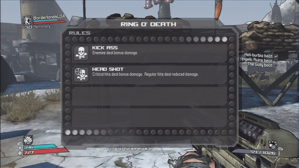 As you progress through the tournaments, Mad Moxxi, being the sadist that she is, will change each wave’s stipulations to randomly include one or more of an assortment of enhancements or detriments to the players involved. There are some overall environmental changes, like lessened gravity or enhanced speed for all players and enemies, but most, on their own, affect only one side of the conflict, and include things like lowered weapon accuracy, bonus damage dealt with certain weapon types, stronger enemies, less damage from critical hits, the removal of shields, and so on.