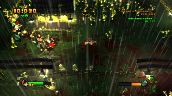 Overall, the graphics are cartoony and nicely done, although lacking detail since the game is played from such a far away perspective. All of the little green zombies appear more laughable than menacing, but by destroying one and sending a mist of blood and body parts all over the environment, there is still a true sense of satisfaction that arises, especially when using a weapon like a shotgun, which allows for multiple zombies to be eliminated at once.