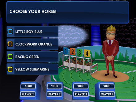 The game is presented in a gameshow style, with your host Buzz, his assistant Rose and representations of the contestants. Each player can pick a character, a costume and a buzzer sound. There are 14 characters are pretty cartoony and very wacky. There’s a superhero, a cowboy, a granny, an Einstein clone, an Elvis look-alike, Napoleon, a mime, a cheerleader and others. Even wackier are the buzzer sounds, ranging from a rooster to a scream, and all sorts of animals, horns and alarm sounds in between.