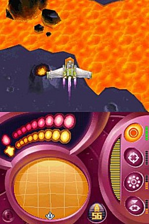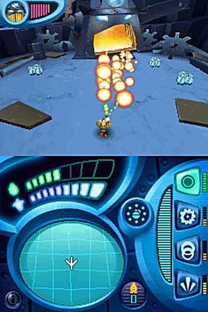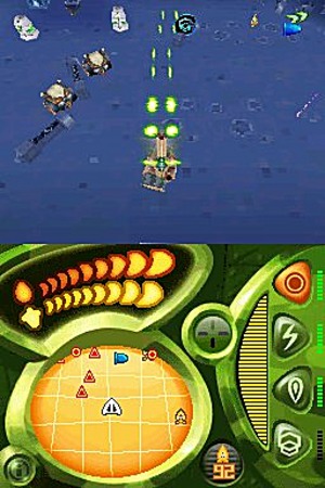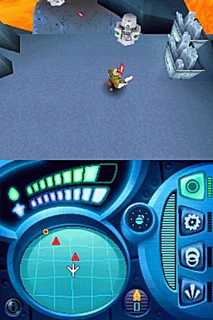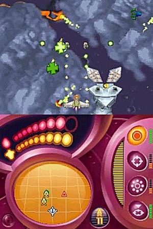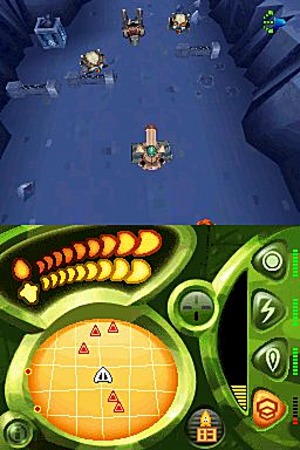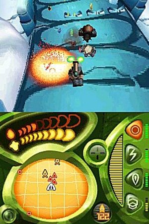 With the action taking place on the top screen, the touch screen acts as weapon selector and statistics monitor, showing you how many fizzles you have saved, how many grenades you have left, how much power for each weapon, and what’s the status of your health and shield. There is also a mini-map that shows enemy locations as they appear (red triangles).