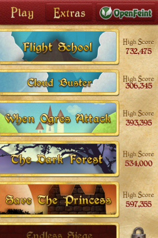 I will tell you one thing – I had the darndest time getting a good rhythm and feel for the slingshot. You fling the gnomes by holding the sling, dragging it down with your finger, and then releasing. However it seemed very easy for me to overshoot my target. There is a little launch path guide to help you, but either I’m still not quite doing it right, or I don’t understand the launch path mechanics. Also, stuff is flying by pretty quickly, so it’s hard to use that launch path all the time, because it takes some time to activate. You can also tilt your screen to help get that last monster around the hill before it escapes behind the edge of the screen. I would definitely suggest you go to “Extras” and then “Settings” to calibrate your phone to this game, because well, anything helps. I’ve found that the smaller the movements, the better.