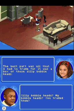 The area maps aren’t very imaginative, and they are placed on a starry blue background as if they were just isolated areas with no connection to the rest of the world. And there is no continuity when you move around either. It’s not like the areas are large either, but still, the screen fades to black whenever you go through a doorway, just like in High School Musical 2. Even if the next area is just a small square room. The characters (yes, you briefly play as Meena and Newt) also seem to move on preset paths, which becomes particularly annoying in places where you need to push crates out of the way, since Cory didn’t seem to line up with them properly.