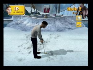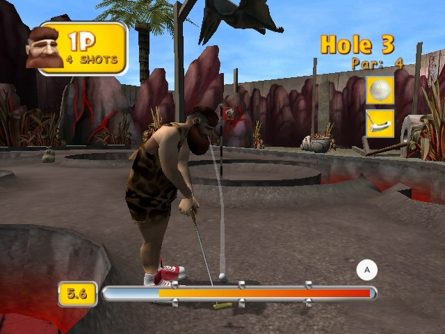 Other aspects of the graphics are sorely lacking. The interface features a flagrant abuse of Comic Sans, while your 3-D be speckled avatar looks embarrassingly like something out of uber-geek Doom. The lack of graphical sophistication seriously lets down the rest of the game. Each course was carefully thought out and decorated down to the Velveeta cheese factor of many mini golf establishments. But with such a basic engine, this eye for detail is lost and the whole picture is tarnished. You’re too busy reminiscing about Oregon Trail to notice the sign advertising “Warm Beer and Bad Service,” the awesome cardboard cutouts of cavemen or appreciate the nostalgia of gopher bashing.