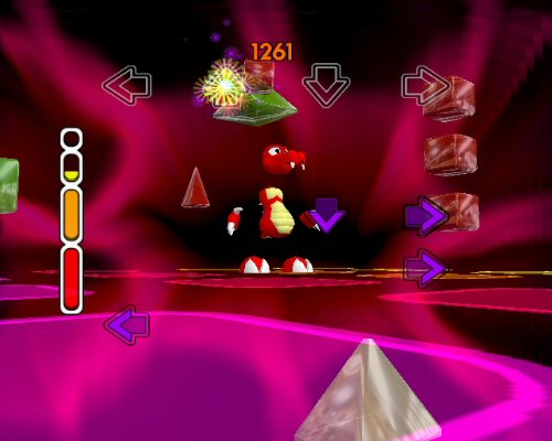 If you get tired of all of this dancing, there’s an additional mini game in the extras called Cubric. You have to keep your cubes alive using only your prowess with dance mat arrows. With a regular controller, it might be easy. But if your foot to eye coordination is as dire as mine, you’ll find it difficult to keep your cubes going in later levels. Dance Factory also allows you to play Cubric while the tracks load up, no need to stare forlornly at your television while the progress bar rolls on. There’s also an additional CD player, where you don’t have to watch the arrows roll to play your music. Just your CD, some graphics and possibly a character.