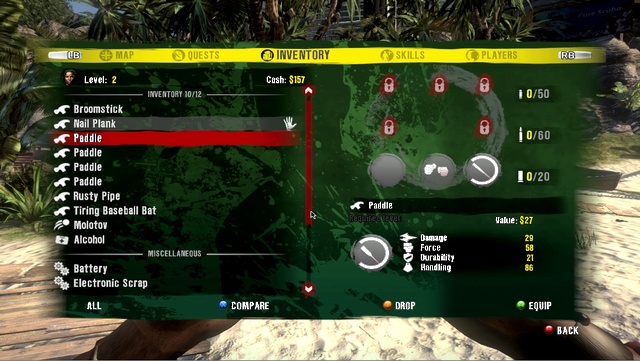 When you reach safe zones, you can repair these weapons with the money and items you’ll find around the island, so at least you’re allowed to keep your favorite weapons once you’ve found something that works for you. Guns are also available once you reach a high enough level, but this is a costly path to take, as ammo isn’t readily available.