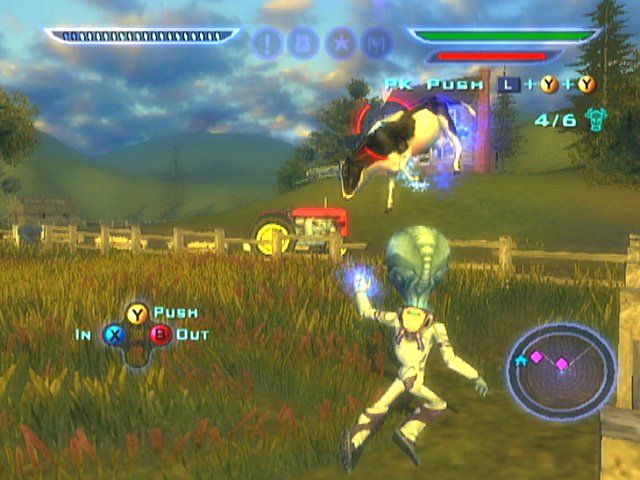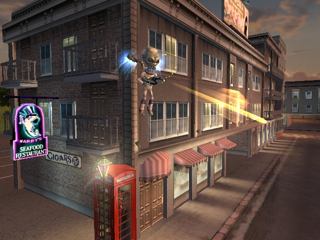 The game is full of sci-fi references from the 50’s and lots of comic relief in the funny cut-scenes, silly comments when you read people’s minds, bits of really bad sci-fi B movies (which play at the drive-in or can be unlocked with gameplay), and hilarious dialogs between Crypto (with his homicidal maniac Jack Nicholson-sound-alike personality) and his superior, Pox.