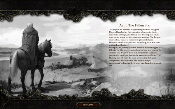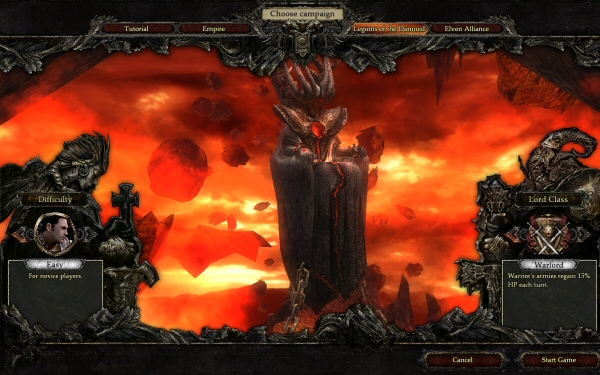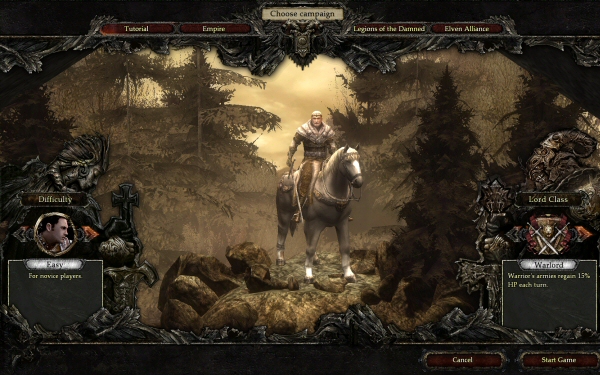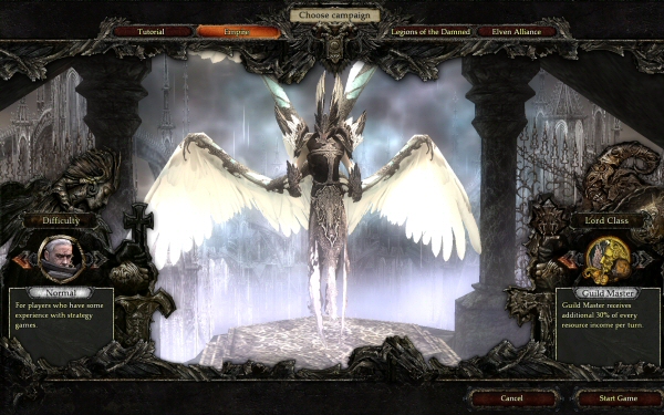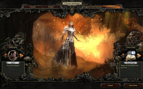 You can play three campaigns: Empire (humans), Elven Alliance, and Legions of the Damned. You can pick a difficulty level, and you can also choose between three class bonuses: Warlord (units regenerate 15% more health per turn), Guild Master (gain 30% more resources per turn) and Mage (able to cast spells on the world map twice per turn).