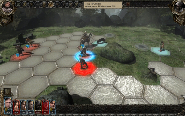 The gameplay is distinctively divided into world exploration and arena combat, the arenas being the battlefields which offer unique bonuses and obstacles. You can find yourself fighting on flat grounds, rocky areas or cracked floors. The movement is defined by the hexagonal tiles, allowing you to attack (and be attacked) in different directions. Some of the tiles will have bonuses for certain classes, such as melee, ranged or magic users, offering a tactical advantage to you – or your enemies, if they get there first. Oddly enough, while obstacles will restrict your movement, they won’t prevent a spell from going right through them.