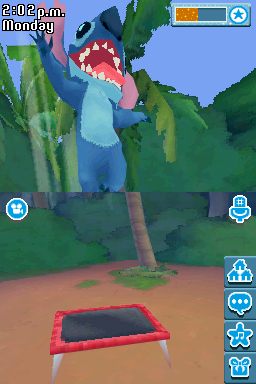 Relying both on the touch screen and on the ABXY buttons, you will need to frequently open the menu to access your backpack’s items, games, special activities, etc. As you begin building a friendship with Stitch, you will unlock new locations to explore, like the fairgrounds and Lilo’s house. But don’t think that once you unlock everything you have completed the game. Since Disney Friends relies heavily on a real-time day and night cycle, each new day in the real world reveals a brand new day in the game as well, a new day that is filled with more feeding, playing, and traveling for you and your friends.