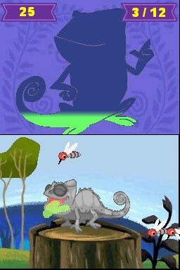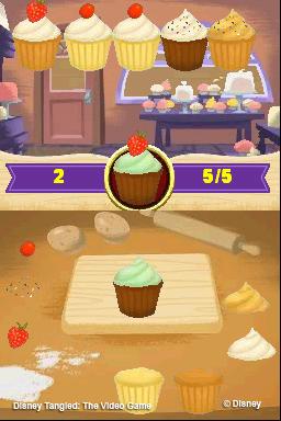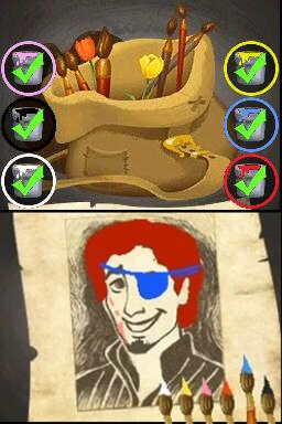 Other mini-games include tapping items and dragging them to a container, a memory game where you are shown all the cards at the start, a 9-piece jigsaw puzzle, assembling things by copying the image on the top screen, playing Simon Says with frogs or burping thugs (…really?! REALLY?! Simon Says with burps?! Was this necessary?), Centipede with Rapunzel’s growing hair at a very slow pace, doodle on Flynn’s “wanted” posters so that people don’t recognize his picture… Oh, yes, but let me tell you about this supposed painting activity: You are presented with a poster of Flynn, and must use the colors indicated on the top screen to alter the image. Here I thought I could draw googly eyes, moustaches and beards to my heart’s desire, but no, creativity is not an asset, guessing is. You must pick up each brush color and run it all over the screen to eventually find the spot where you have to rub it on. Every spot is invisible until you touch it with the right color brush, and for smaller areas (such as painting an earring or adding some freckles) it’s pretty frustrating.