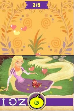 The mini-games were fairly disappointing. There aren’t many of them, and they repeat quite a bit, only with a slight variation. The most repetitive game is befriending an animal. Here you will see Rapunzel sitting and some little creature (reminiscent of Bambi artwork) slowly approaching. The purpose of the game is to repeat the sequence of commands shown at the bottom screen, and for each correct movement the animal will move towards the girl. Most of the commands are gestures to do on the touch screen, but others show as a speech bubble, which means speak to or blow on the microphone… except nowhere does it say that this is what you have to do to clear those commands.