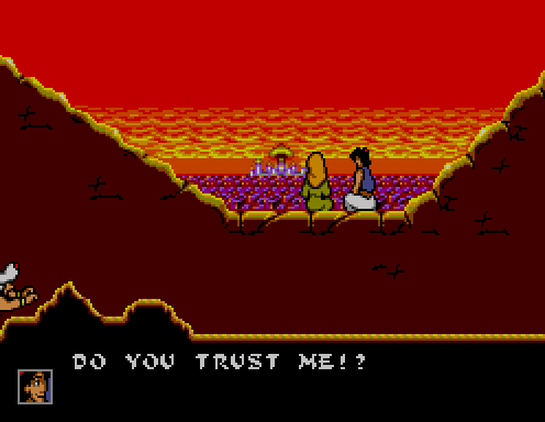 Aside from the action type of gameplay, there are also collectibles spread throughout the different levels that add a little extra something to the game. By collecting gems you can purchase extra lives and continues from a travelling merchant. But there are other collectible icons that unlock bonus levels. The Genie level is a game of luck, where you can win gems, extra lives or apples. The Abu level is a mini-game in which you control the little monkey to catch certain items that fall from the sky, while avoiding the “bad” ones.