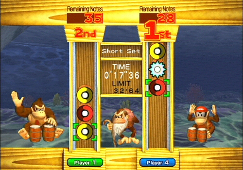 The basic controls of Donkey Konga 2 are virtually identical to those of its predecessor, which is not surprising, given that the barrel bongos are a slick little peripheral and thus the game’s interface needs few improvements.