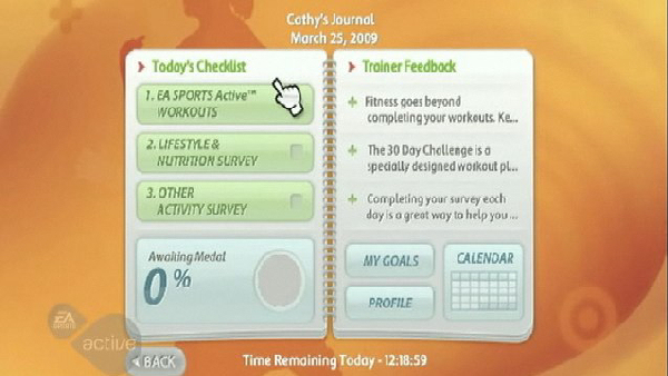 The Fitness Journal tracks your exercise progress, gives you feedback, shows you the medals you have earned and lets you access the checklist. The checklist has some quizzes that you can fill out regarding your nutritional habits (how many soft drinks you had, how many meals) and other activities you may do and at what intensity. My domestic triathlon is an activity after all!