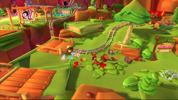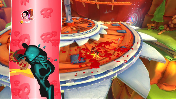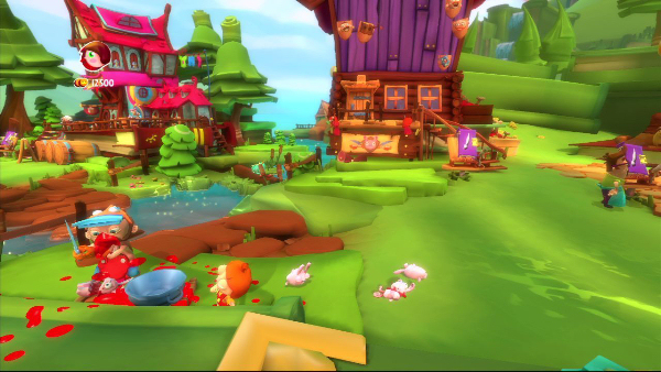 This gore becomes more pronounced the longer you play, as enemies are sent to you in higher numbers and are of a greater strength, requiring more hits to slay, and therefore allowing more time for the blood to pour. However, the novelty of sliding around in the blood pools that remain, or even that of watching a gingerbread man or giant squirrel’s head roll across the path in front of you is short lived.