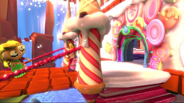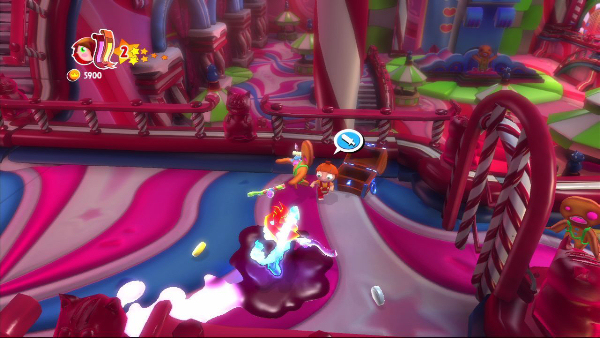 The game’s story itself is a very loosely structured take on classic childhood stories. The story lacks real continuity between levels, but for the most part is split into two distinct sections: the first sees you tracking down a Candy Witch who has stolen a kettle from the Three Bears, and the second has you rescuing a group of stolen princesses, apparently because you want to marry one of them yourself, but more so because a Giant (think Jack and the Beanstalk) wants to eat them.