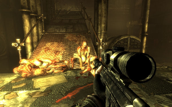 Let’s talk about those visuals for a minute. Playing through The Pitt is like running around on the inside of a Tool video trying to resolve labour disputes – everything is rusty metal, big pipes spewing gouts of liquid-propelled flames for no apparent reason, big dirty guys in leather slave harnesses, power tools, gas masks, and oppression and pestilence symbolism everywhere. It’s the same over-the-top ‘bleak horror’ atmosphere that the main game captured so well, this time done industrial-style (and, again, something that makes The Pitt feel so much more themely than Anchorage did).