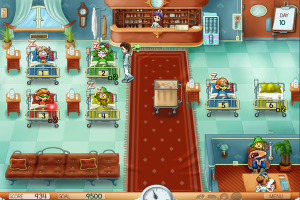Of course, there are several added challenges. Patients have different colors of PJs, so you get bonus points by matching them to the respective color beds. A virus will appear now and again, and you must use the spray to get rid of it. Patients will occasionally sneeze or cough onto the next beds, making others unhappy.