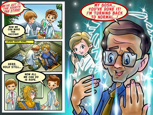Mad cow disease patients have turned into cows and they moo, horse throat (yes, I spelled it right) victims have horse heads and they neigh, hay fever patients look like scarecrows and sneeze a lot, children with chicken pox cluck, it’s just too funny to see.