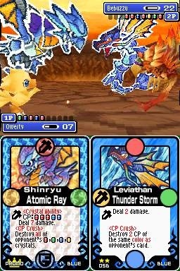 Each card has four attributes related to the elements, represented by red, blue, green and yellow circles on each edge. If there’s a shield on a given color, that means the card will defend attacks from a card of that color. If there’s a sword that means it can defend half damage of an attack of that color. A colored card’s attack will always give you a crystal of its respective color. These crystals are used by Crystal Abilities of certain cards. It may sound complicated on paper, but when you first play with the Moogle and get him to explain everything, it’s not that bad.