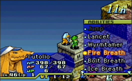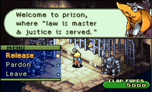 As the game goes along, you learn that there are laws governing your battles. These laws basically dictate abilities you cannot use during a battle or else you get penalized by the judge (who watches over the battle ominously). A law’s counterpart ability allows you to gain judgment points (JP), which will eventually help you in combo attacks and something called “Totema,” which become available for different races as the game progresses, as a powerful attack that targets all enemies. Clan members also gain JP when KO’ing an enemy in battle. If you break a law during a battle, you’ll get a yellow card from the judge, and if you have 2 yellow cards you get a red card, which sends you off to prison! The prison is in the city location Sprohm, and you can go to release the clan member by paying gil. Also, you can pardon clan members who have yellow cards already by doing certain tasks, like suspending your clan activity or such, but generally it’s not a big deal unless your clan member is actually imprisoned (in which case, I’d just reset the game back to the save point and remember not to break the law again!)