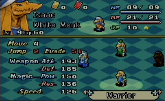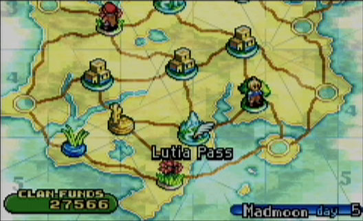 The battle itself is kind of like playing on a chessboard, where each clan member takes up a space on the map, and can move a certain number of spaces. It’s pretty self-explanatory, any gamer should be able to figure this out! It’s a turn-based battle, and speed is a factor in how soon a turn comes up, so keep that in mind when selecting clan members for a battle. When you select “Move” for the active clan member, squares are highlighted in blue showing you where you can move that clan member. The “Action” menu will have all the abilities available for that clan member. You can pick and choose what goes in your Action menu as well, either just before battle begins or in between missions on the main map. All clan members will have the “Fight” command which basically just involves whacking the adjacent enemy unit with your weapon (be careful though, some weapons actually will heal the target). Many magic and skill abilities will allow you to target an enemy from further away, and some will allow you to target an area of adjacent squares or even the whole map. There will be some turns you won’t be able to do anything at all, in that case you just select “Wait.” At the end of the turn you determine what way your clan member will face. This is important because for physical attacks, you can do more damage to an enemy’s backside, and less if they are facing you directly. So it’s always a good idea to face your clan members in such a way to prevent their backs from being exposed.