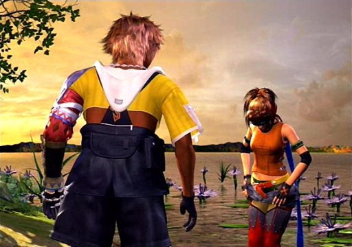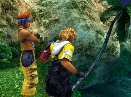 The story of Final Fantasy X revolves around your main character, Tidus, a young blitzball star (more on “blitzball” later) whose hometown of Zanarkand gets ravaged by a destructive force called Sin, and then is somehow transported to a strange land, apparently 1000 years into the future where hardly anyone has heard of Zanarkand, and those who have get very nervous. Tidus is rescued by a girl named Rikku who speaks a strange language he’s never heard before, only to be swept up again and onto a beach where he meets Wakka, also a blitzball player (apparently blitzball is still around after 1000 years), who welcomes Tidus into his town despite the people’s objections. He also meets Yuna, who is a young summoner, on a pilgrimage to defeat Sin. They are also accompanied by Lulu and Kimhari, who are guardians of Yuna. Then there is Auron, a mysterious dark man who took care of Tidus when Tidus’ father disappeared long ago. All eventually accompany Yuna on her quest to defeat Sin, which involves acquiring entities called Aeons that are summoned by Yuna in battle, similar to the Guardian Forces in Final Fantasy VIII and Espers in Final Fantasy VI, but only Yuna can use them.